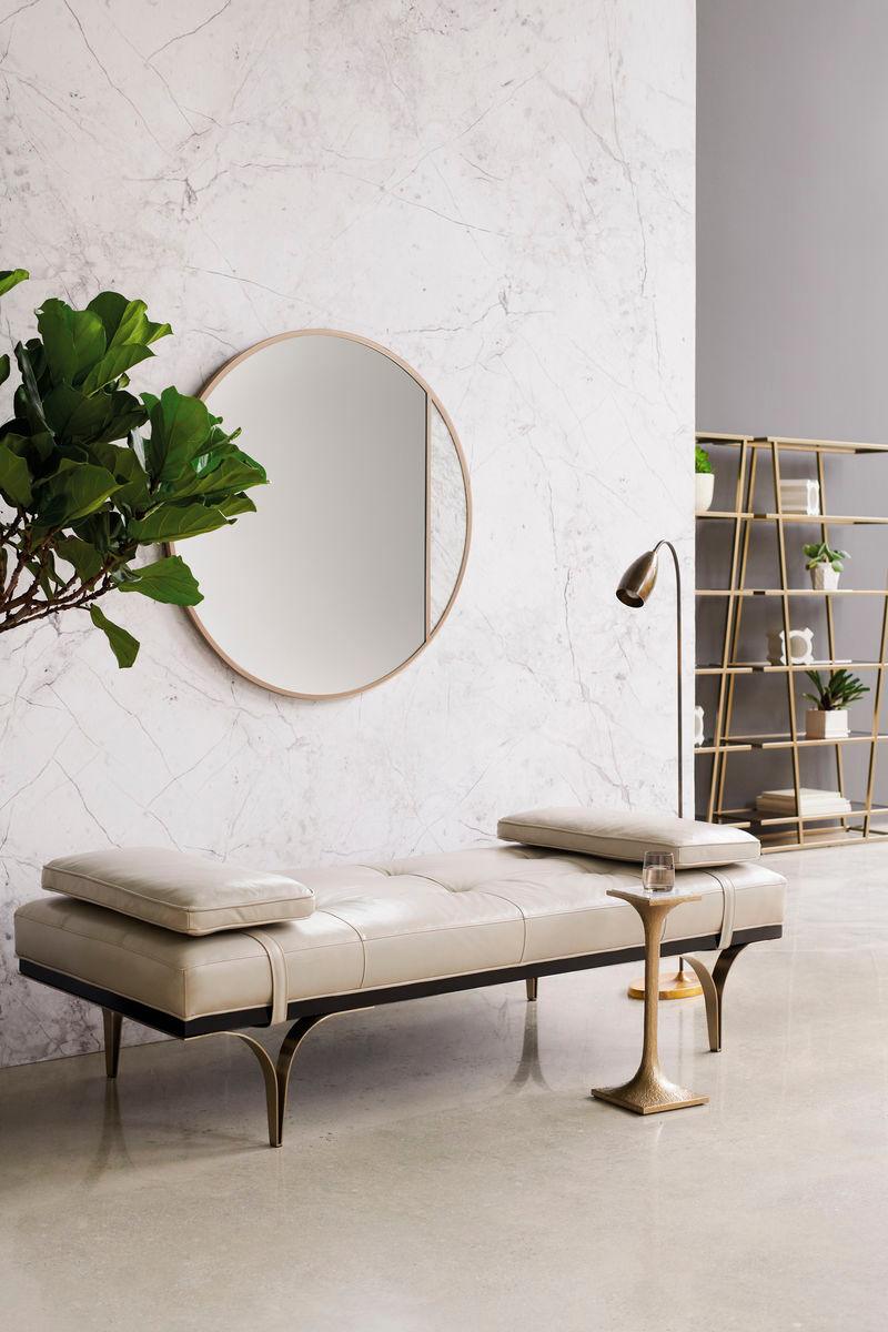 Open metal legs. Slim wood base. Removable leather bolsters. Tight seat.