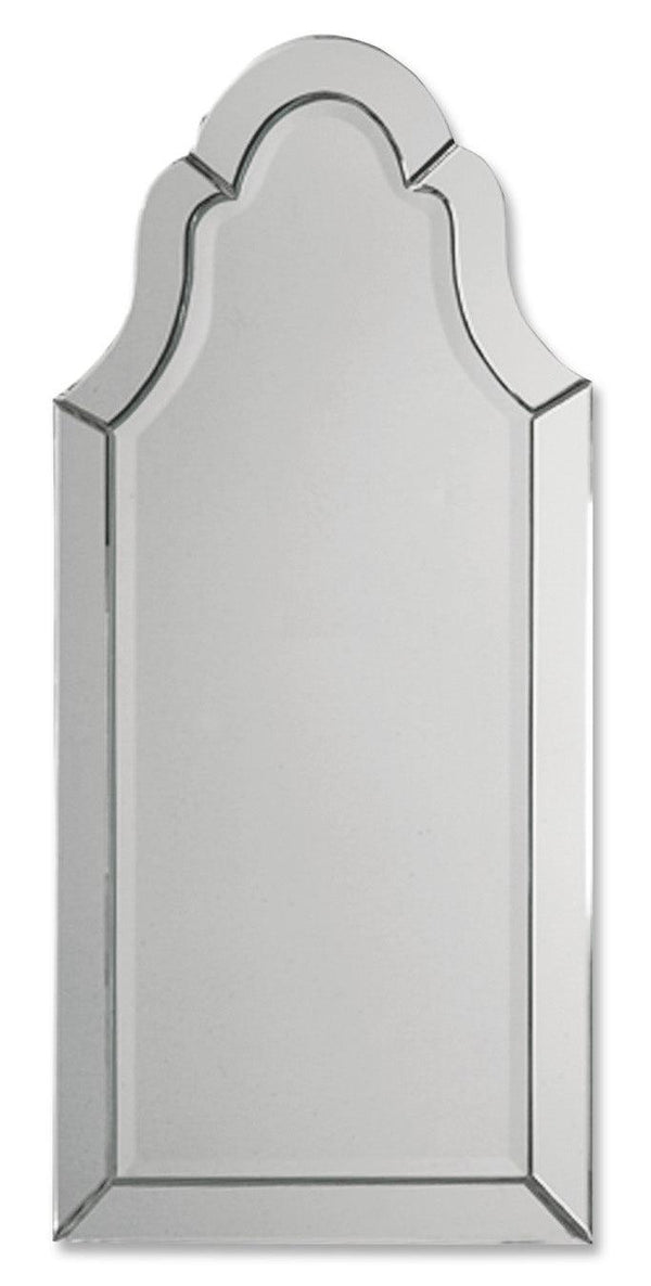 This Frameless, Arched Mirror Has Polished Edges For A Smooth, Clean Finish. The Etching And V-grooves Give Wonderful Character To This Beveled Mirror.