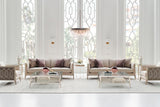 Decorative carved metal and wood detail on outarms. Loose seat and back cushions.