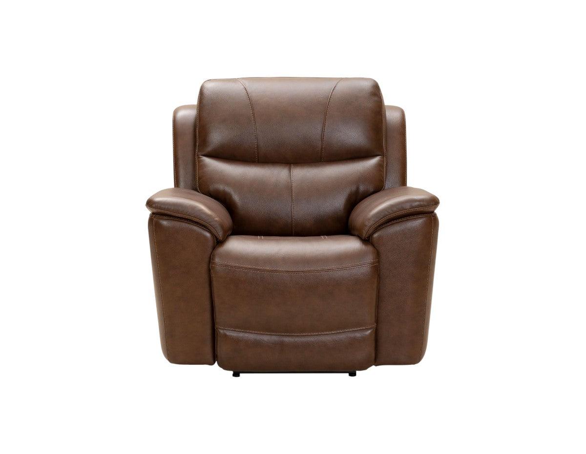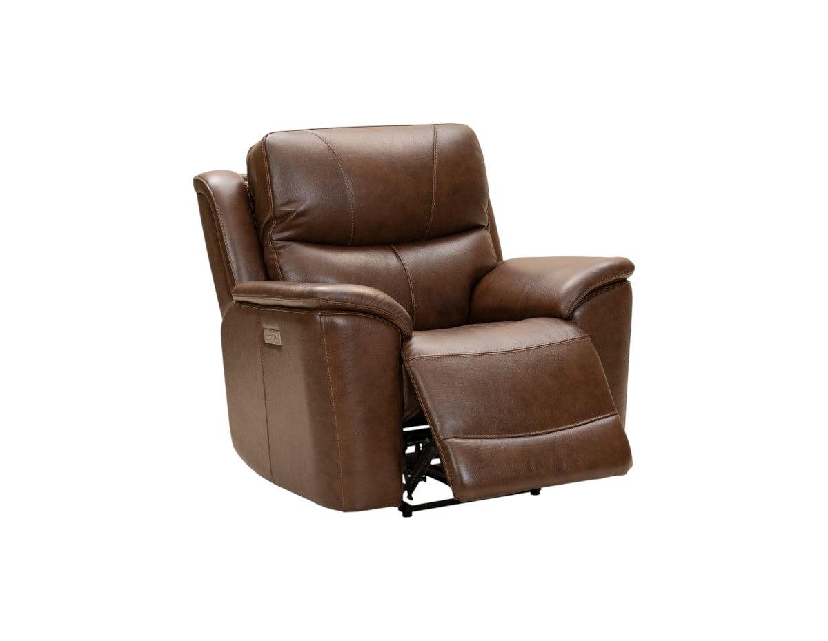 Modern pubback styling power recliner features oversized boxed styled pad over chaise seating with pocketed coils, slim line wedged pillow arms, and power recline with power lumbar and power head rest. Decorative stitching accents the back and chaise front.