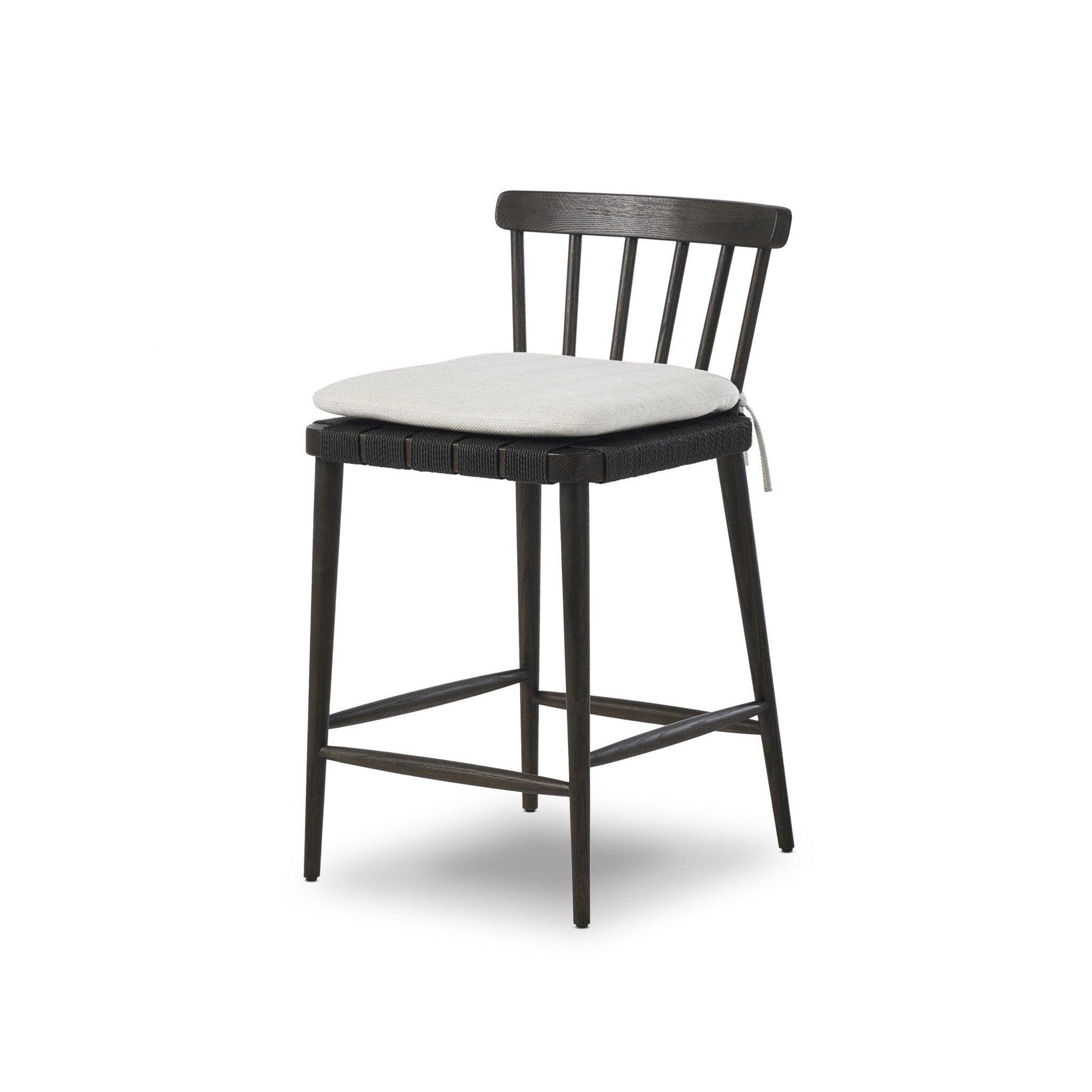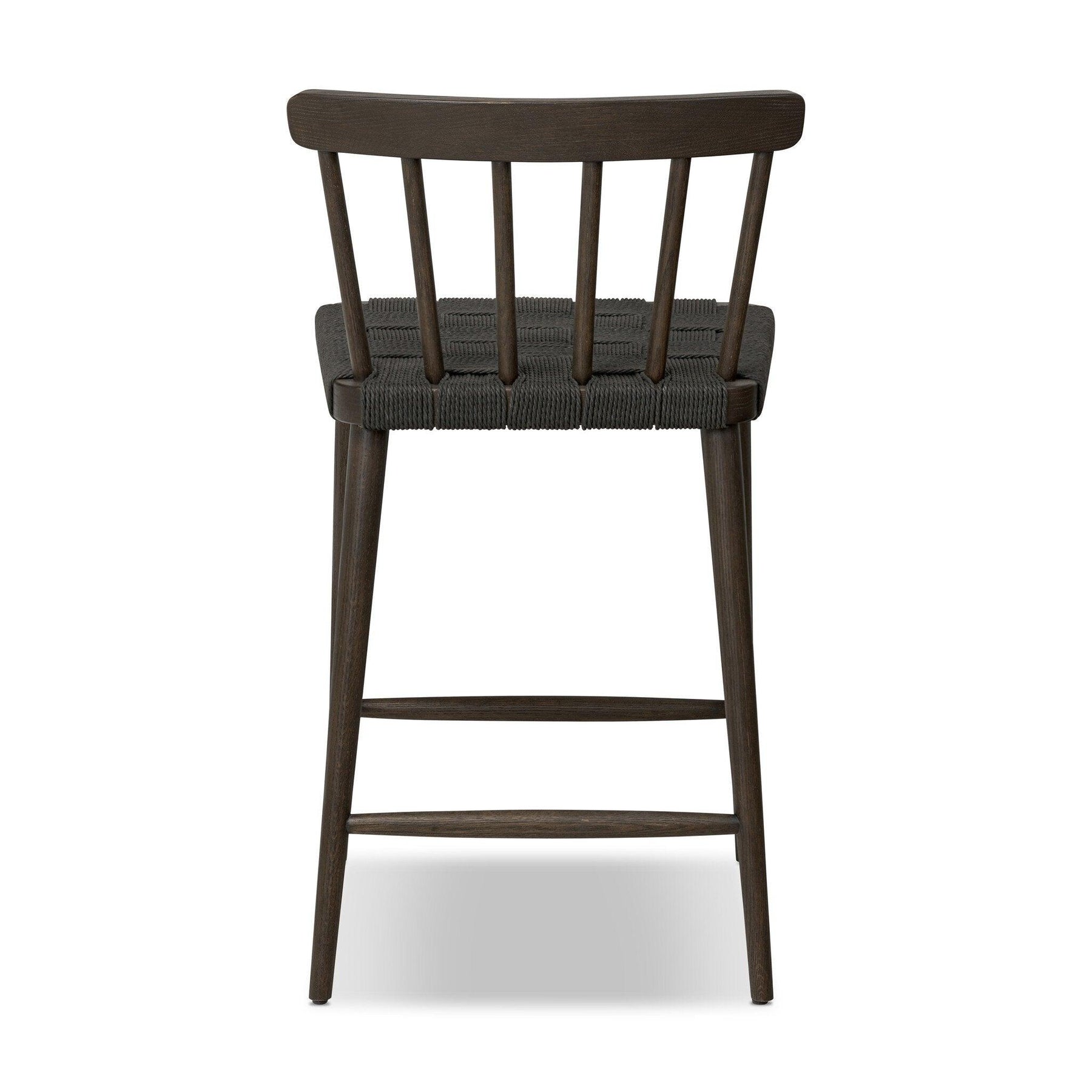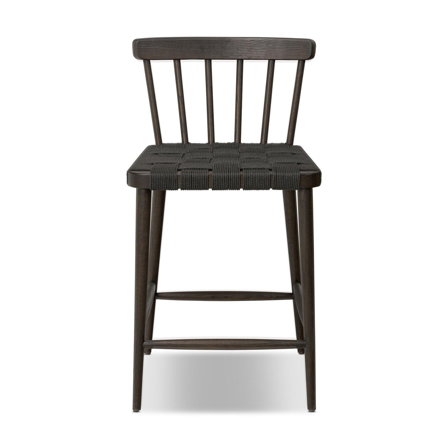 Black oak and charcoal basketweave pair up for a monochromatic and textural take on the counter stool. With a mid-profile Windsor-style back and tapered legs the piece stays true to traditional form.