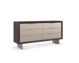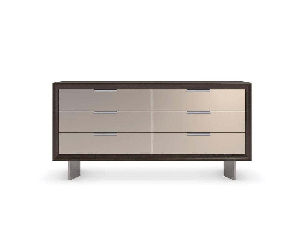Case finished in Sepia. Six drawers with Bronze mirror fronts and undermount soft close guides. Top left drawer with floating jewel tray. Feet in Smoked Stainless Steel Paint. Base with adjustable levelers. Drawer interior in Soft Silver Paint.