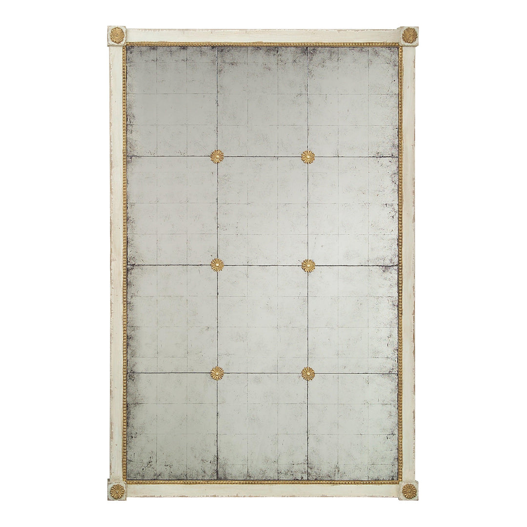 A plain beaded frame in antique grey and gold surrounds twelve eglomise mirror tiles with six gold rosettes at the junction to four files which repeat at each corner of the frame.