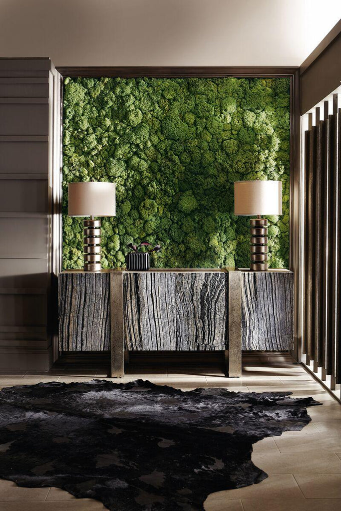 Entertainment Credenza Cerused Greige Finish/ Four Pull To Open / Soft Self Closing Doors W/ Laminated Black Forest Marble Door Fronts/ Behind End Doors Are Two Adjustable / Removable Shelves And One Fixed Bottom Shelf Surface/ Behind Center Paired Doors Is One Fixed Shelf/ One Drawer W/ Wrapped Pad And Hand Cut Out And One Fixed Bottom Shelf Surface/ Cast Aluminum Frame In Textured Graphite Finish / Which Wraps Over Top And Down Front Of Caseforming Base/ Black Adjustable Glides