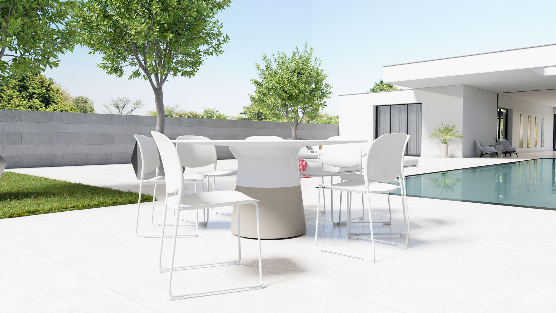 The MALDIVES dining table series is beautifully crafted with a solid surface resurfaceable table top that can be left out year-round. It is mold and mildew proof, stain resistant, UV resistant, chemical products resistant, anti-absorbent and non-porous. Available in 2 sizes, 49 inches and 63 inches in diameter, the tops are seamlessly blended to the sturdy concrete polymer base which has its own built-in leveling feet to perfect all those random outdoor surfaces.