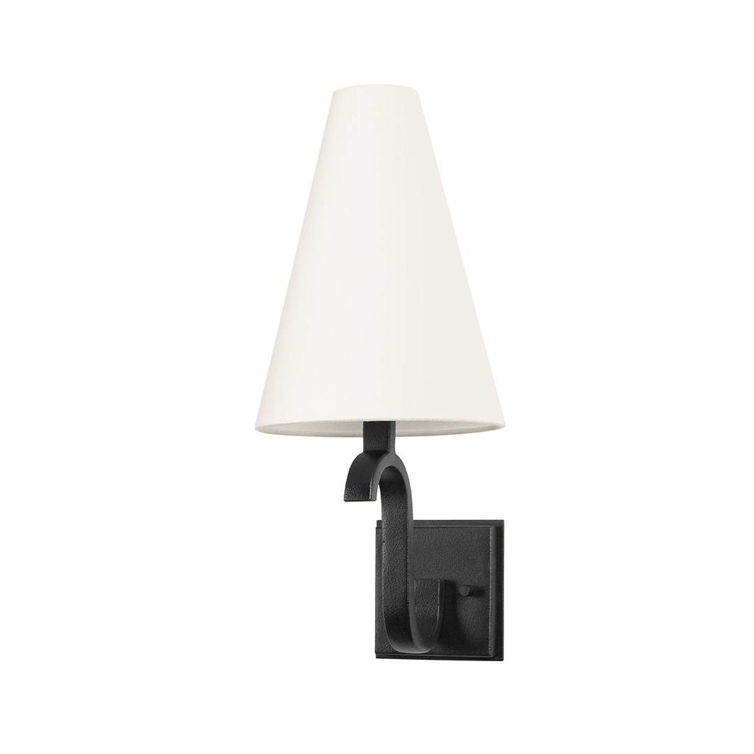 Traditional off-white linen shades contrast against soft, swooping Forged Iron metalwork to create the perfect transitional piece. Available as a one-light sconce and three- or five-light chandelier, Melor adds chic style to any interior.