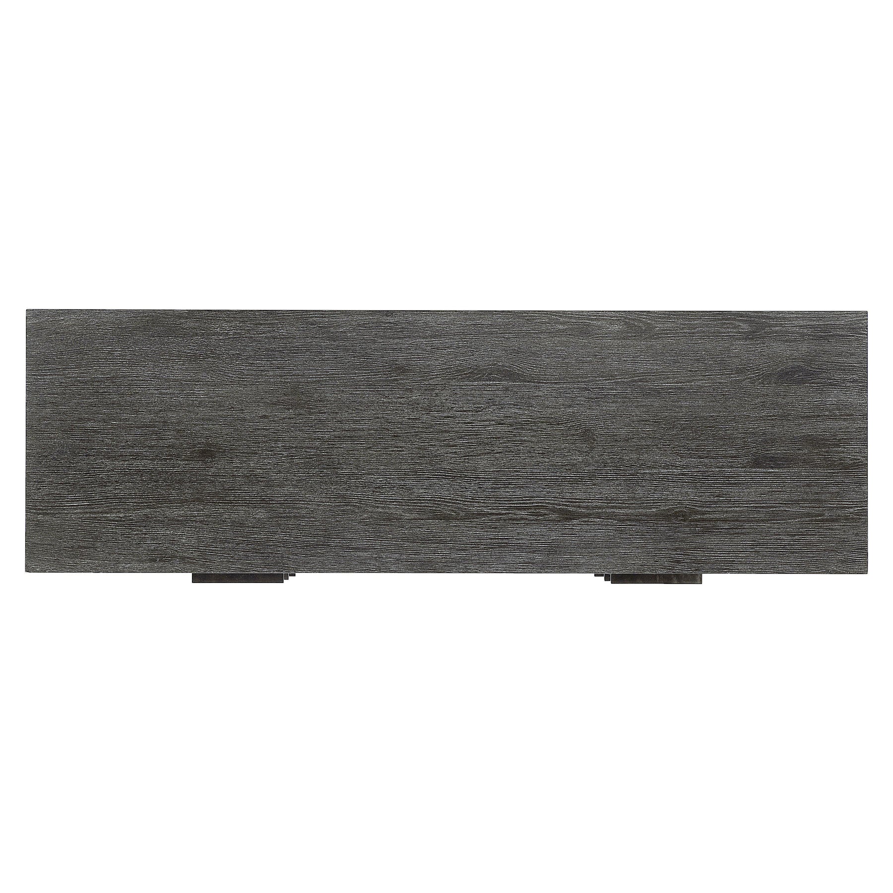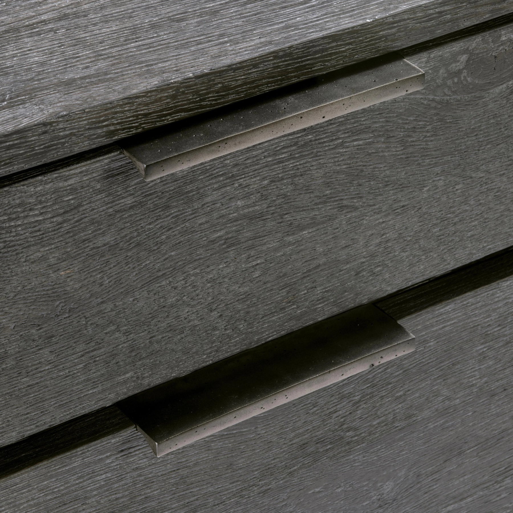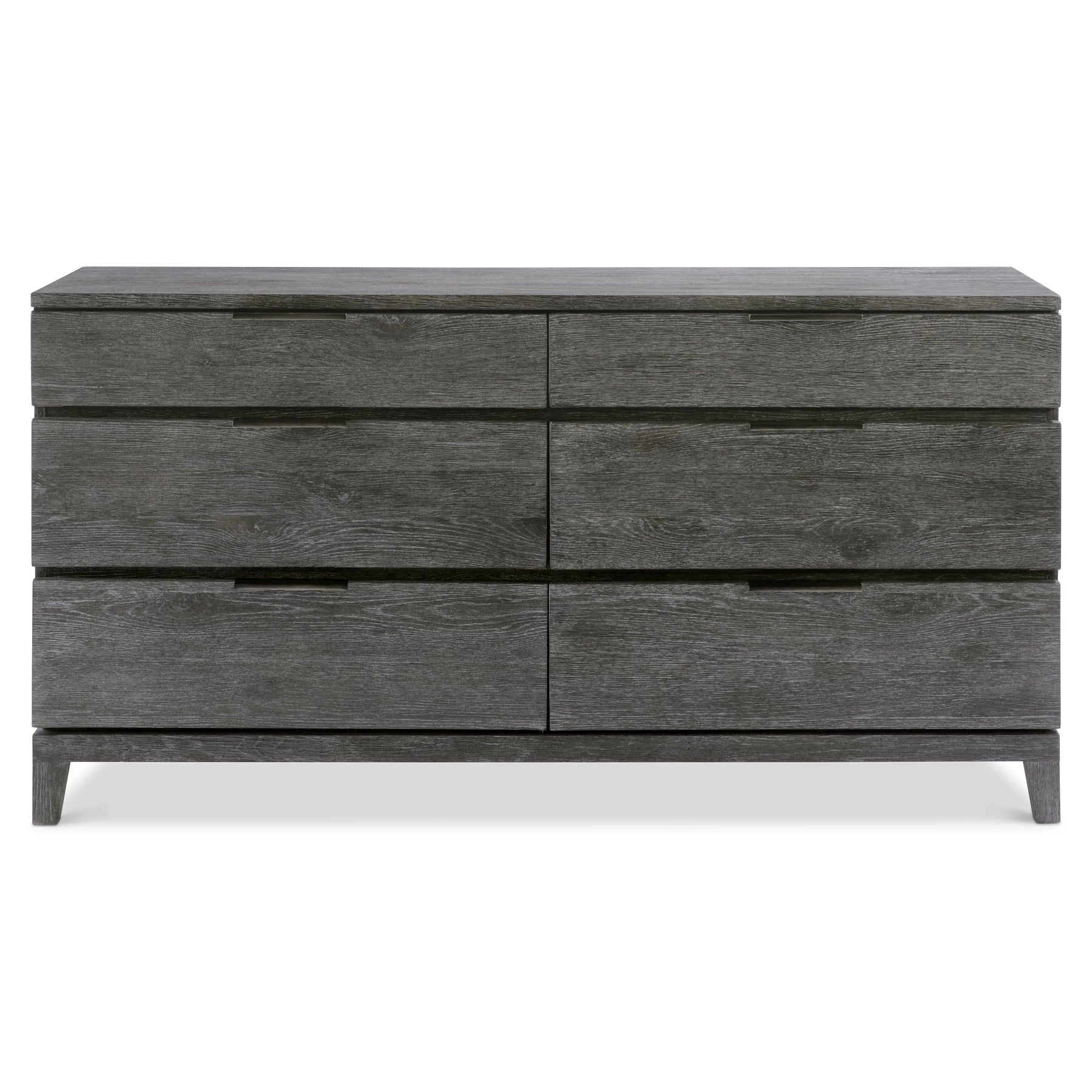 Rustic Oak Dresser In Sutton Finish. Six Pull-To-Open Drawers With Cast Aluminum Tab Pulls In Dark Graphite Finish.Adjustable Glides.