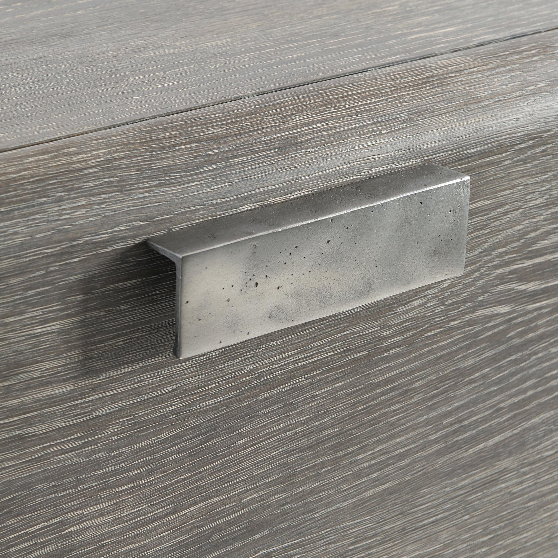 The Monolith Dresser Has A Distinctive Modern Style With An Offset Vertical Post Between Two Sections Set On Plinths. On The Left Are Two Deeper Soft-Close Drawers With Cast Aluminum Tab Pulls In Graphite Finish. On The Right Are Three Longer Drawers With The Same Beautiful Hardware. The Overall Design Has A Deeply Textured Look In Puma Finish.