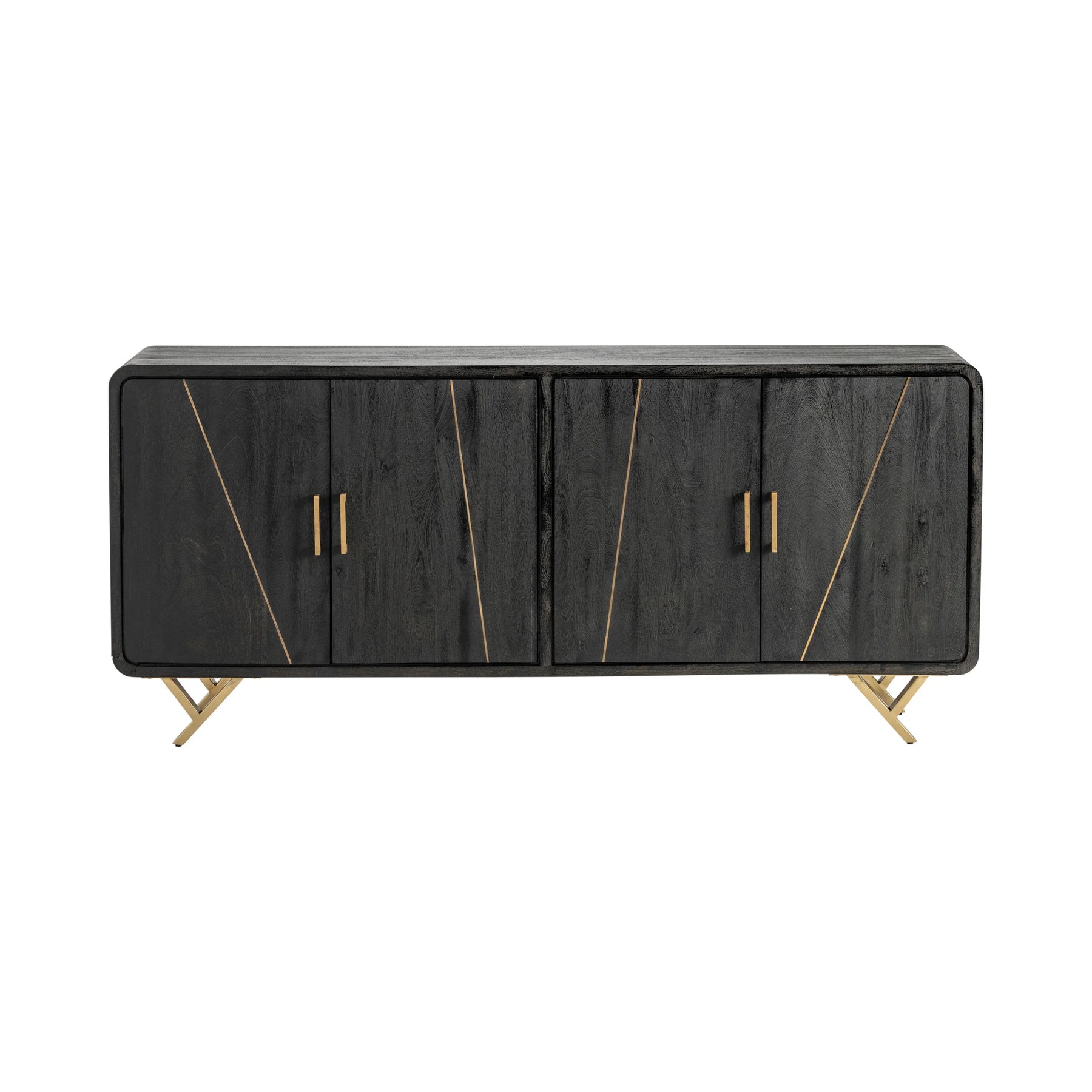 Elevate your space with our stunning 4-Door Media Credenza. Crafted from black natural wood grain Mango, its sleek frame is complemented by brushed gold powder-coated iron legs, creating a striking contrast. The four doors, adorned with brushed gold linear accents and handles, open to reveal two interior fixed shelves, perfect for stylish storage. Thoughtful details like adjustable levelers, cord management holes, and easy assembly make this sideboard both functional and effortlessly chic.