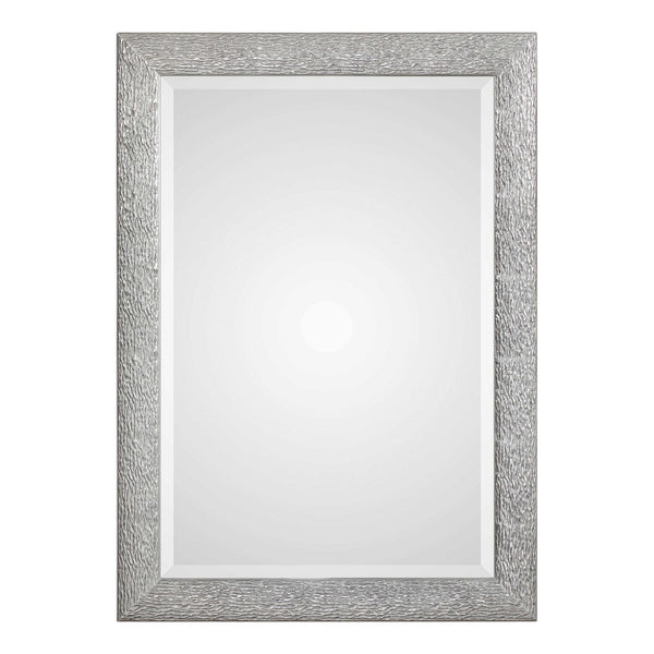 Solid Wood Frame Featuring An Embossed Wavy Texture, Finished In A Metallic Silver With A Light Gray Wash. Mirror Features A Generous 1 1/4" Bevel And May Be Hung Horizontal Or Vertical.