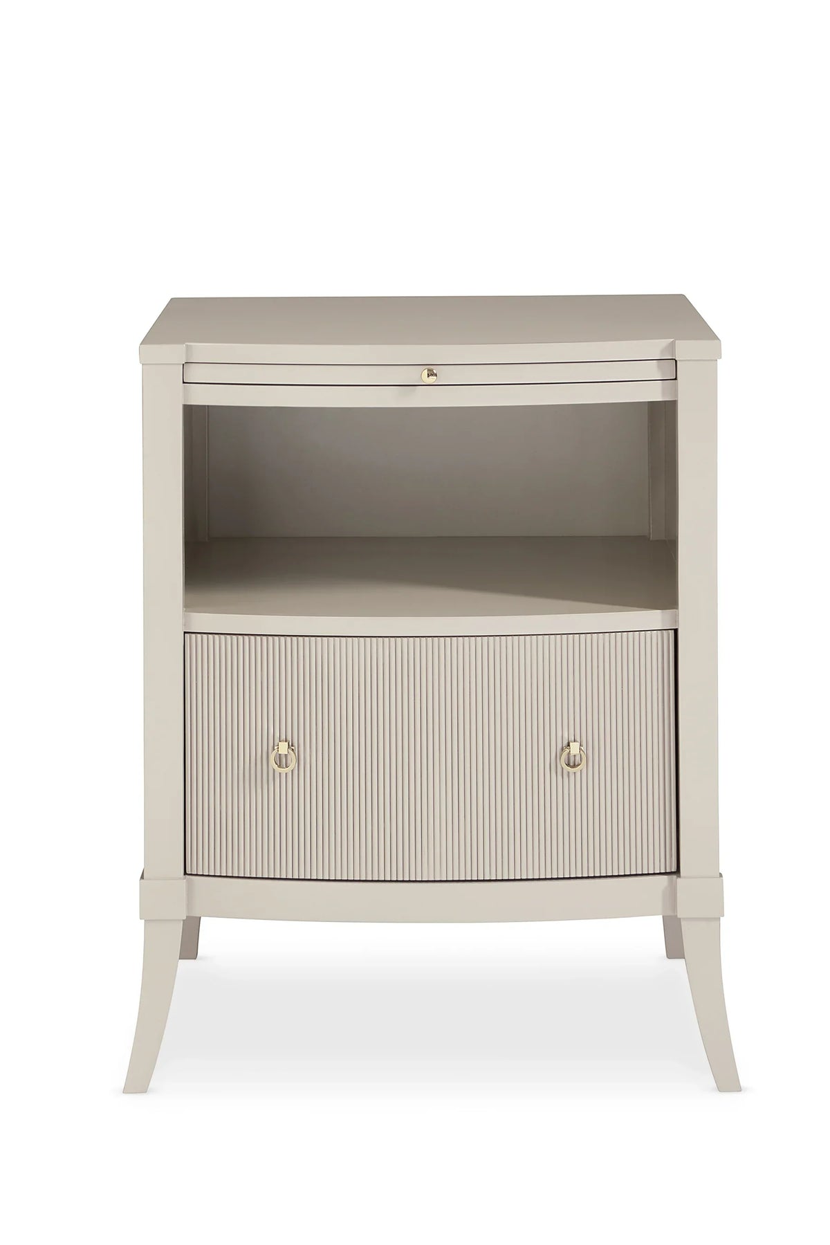 Every signature bed deserves a stylish companion and the New Love nightstand is the perfect fit. Designed with both fashion and function in mind, it features a soft Matte Pearl finish that feels visually light while complementing any finish or fabrics in the room. An open compartment with a pull-out shelf adds convenience and a touch of glamour, as does a cord access hole for easy charging. With open and hidden storage, this elegant bedside creation is thoughtfully designed for everyday luxury.