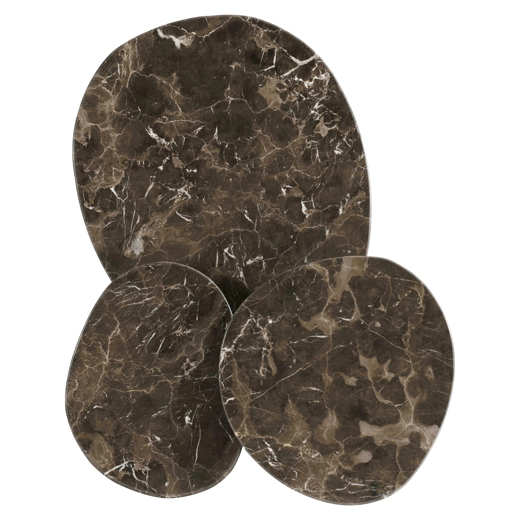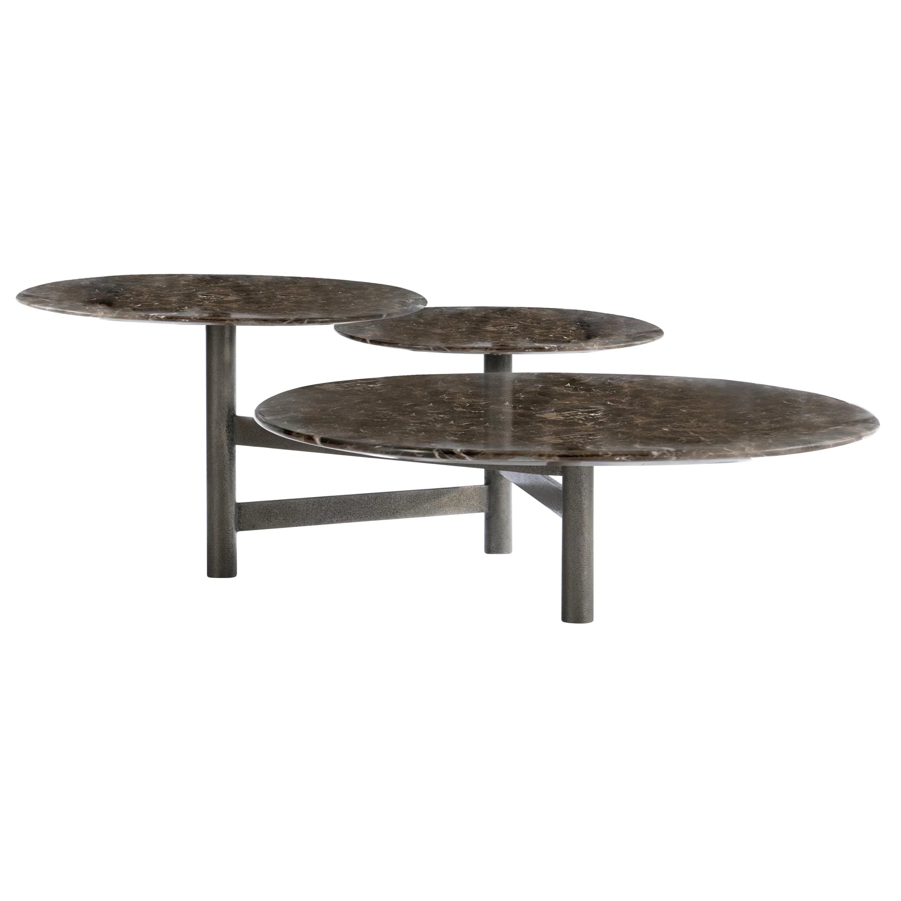 Multi-Level Height Cast Aluminum Cocktail Table In Graphite Finish With Three Rounded Edge Brown Emperador Marble Stone Tops Of Varying Sizes. Each Stone Rests Atop One Of The Multi Level Metal Posts. Adjustable Glides.