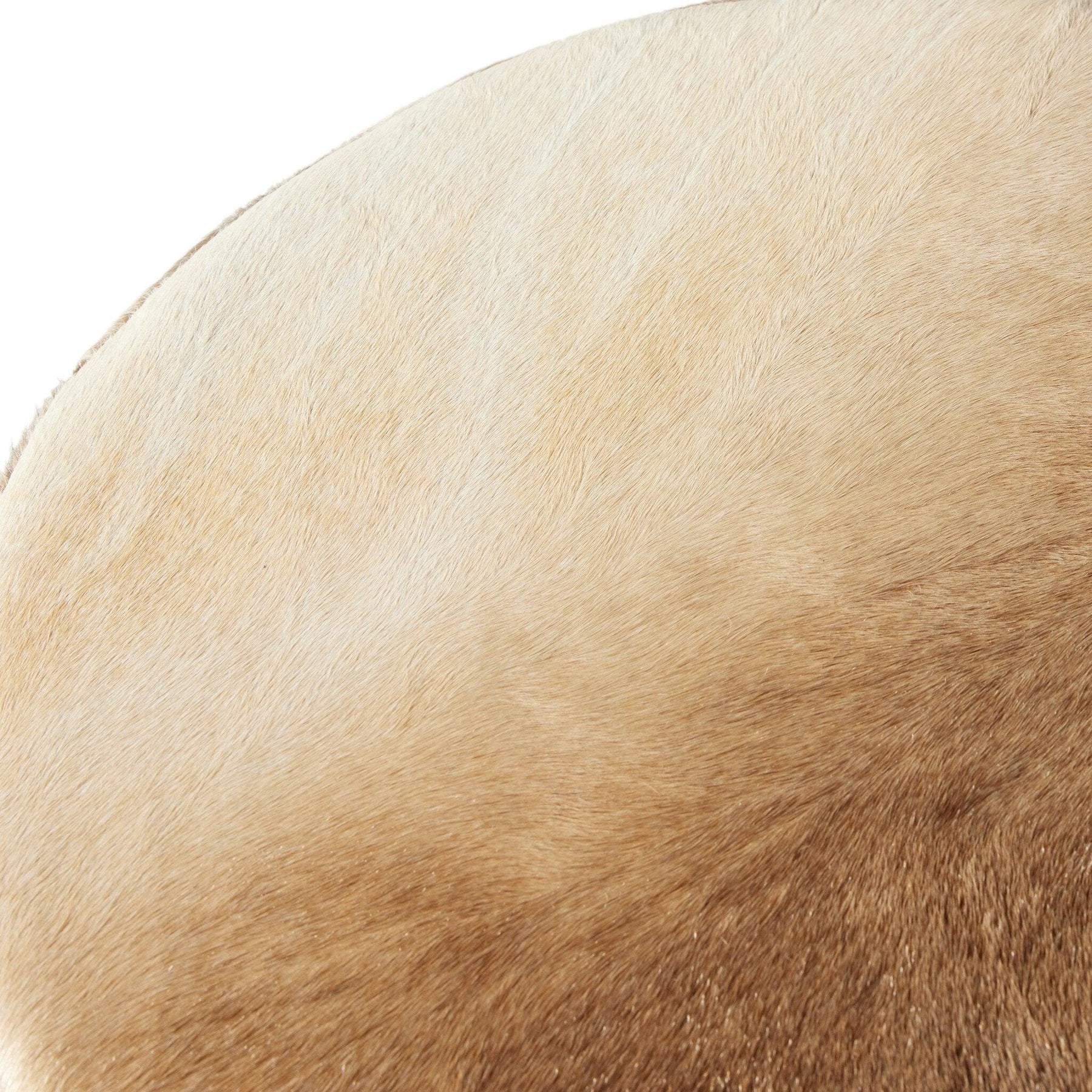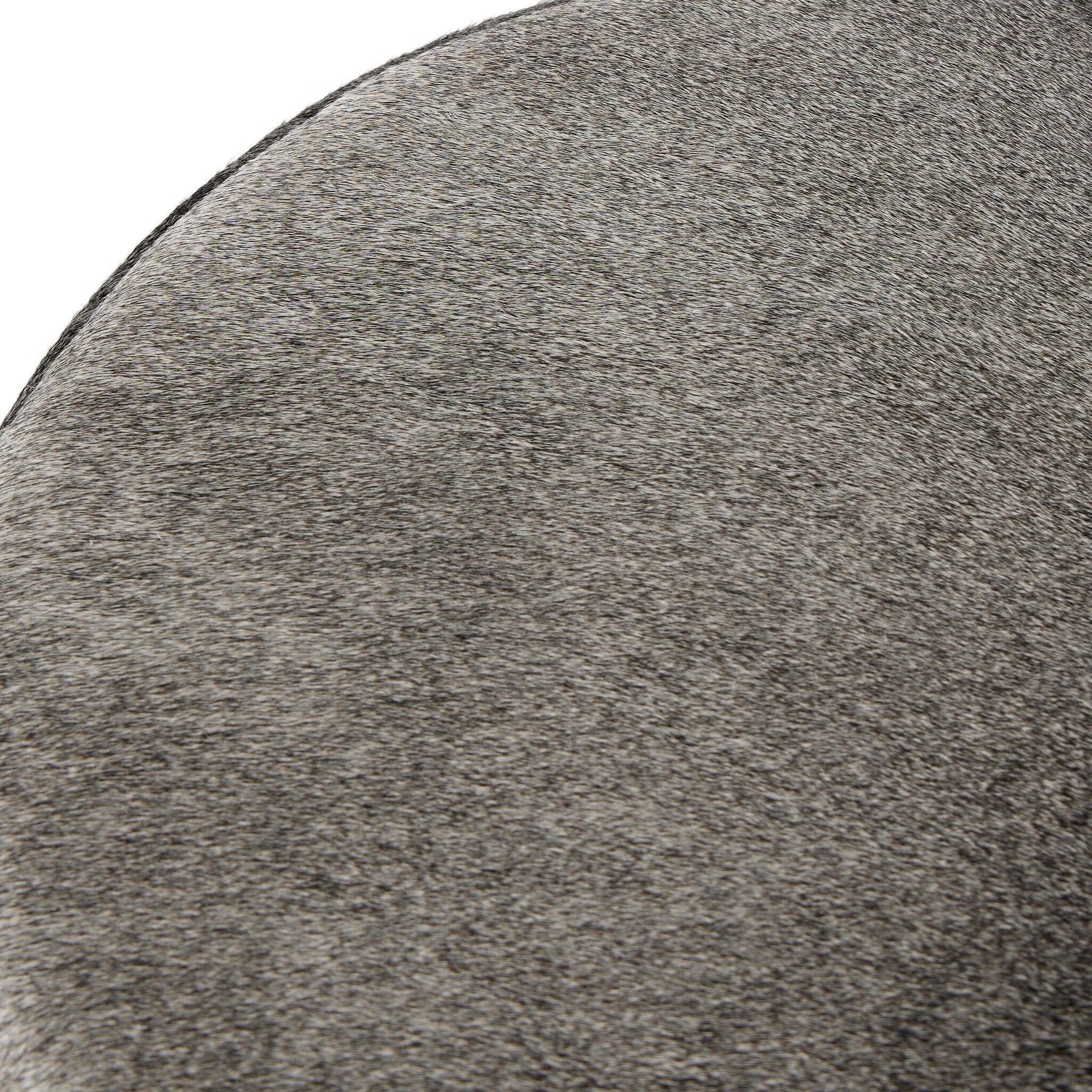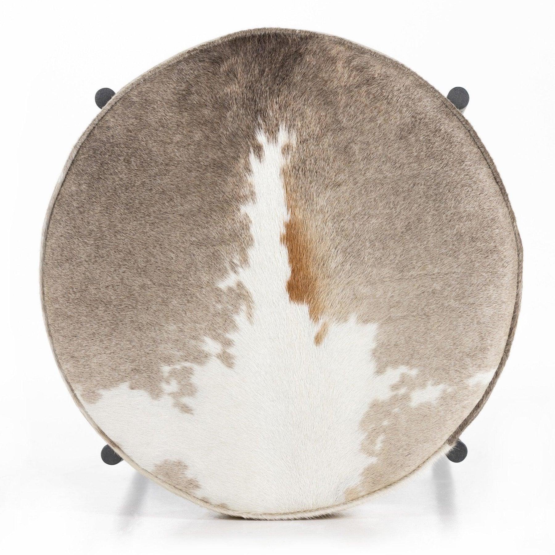 Slim and airy gunmetal-finished iron legs form a cradle-style frame for black and white speckled hide seating perfectly sized for the counter. No two hides are the same. A variance in hide color shape pattern and hair length is to be expected reflective of natural materials.