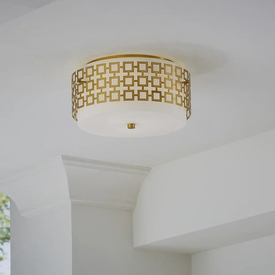 Our Parker Flush Mount features our classic Nixon pattern in a sleek, laser-cut metal iteration, further illuminated by the clean backdrop of the frosted cased glass interior shade.