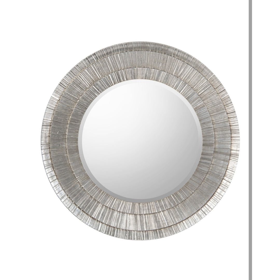 A three-tier frame in a silver finish surrounds a round, modern beveled mirror. French cleats are fitted.