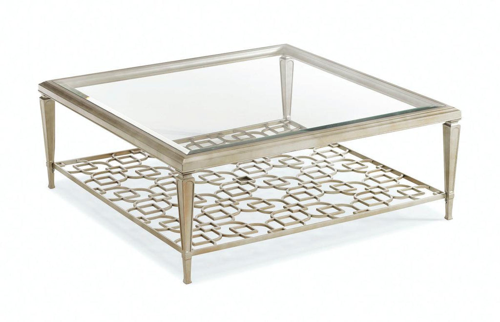 Metal frame. Glass top. Shelf at bottom with trellis pattern.