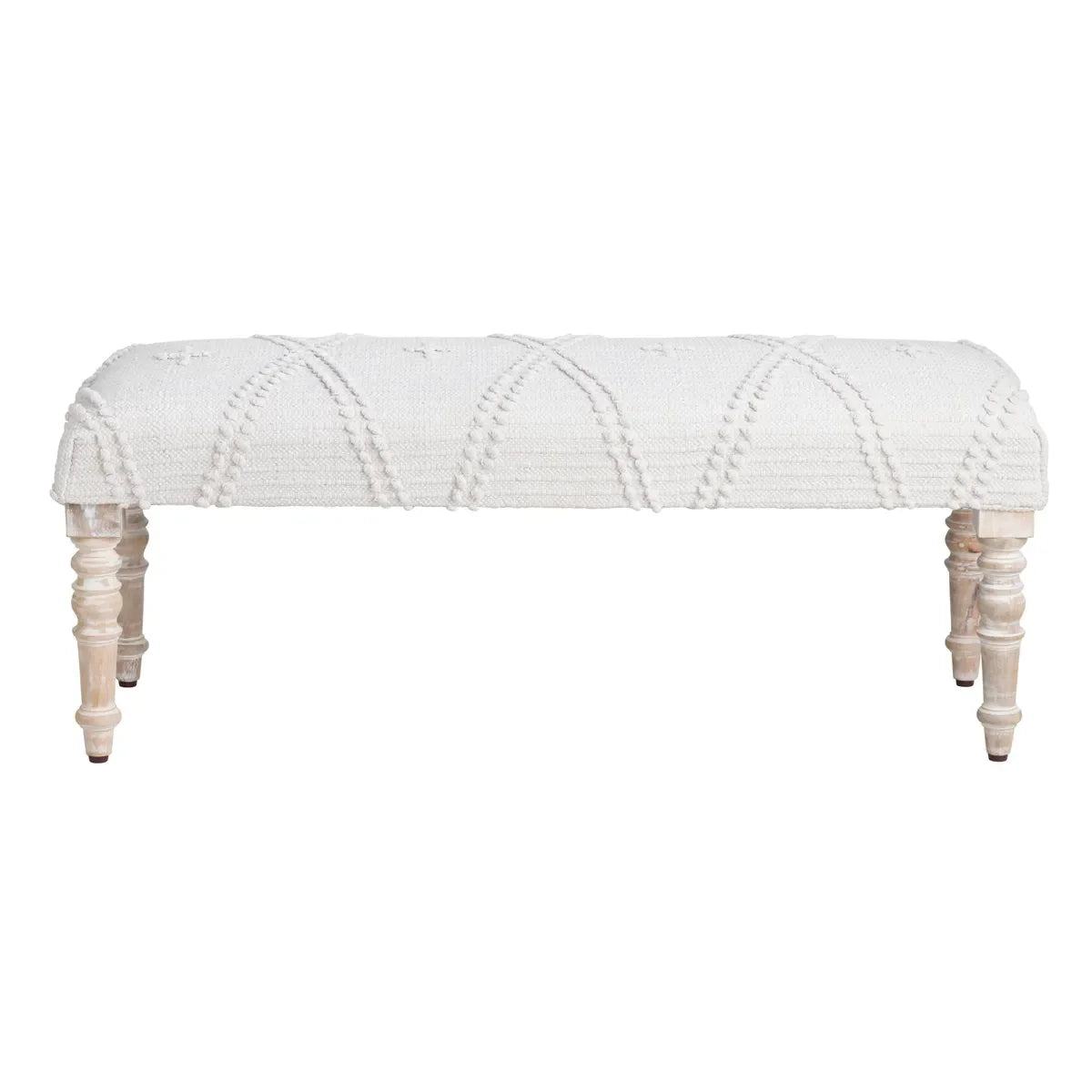 Bring sophistication and comfort to your space with our Upholstered Accent Bench. The creamy white cotton fabric seat, adorned with a tufted geometric pattern, offers a soft and stylish touch. Solid mango wood spindle-style legs feature a whitewashed finish with brown undertones and natural wood grain, adding rustic elegance. Perfect for any room, this bench is as functional as it is beautiful. Easy to assemble—just add the legs for an instant upgrade to your décor.