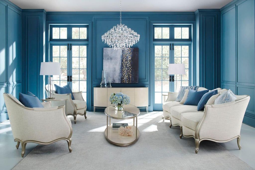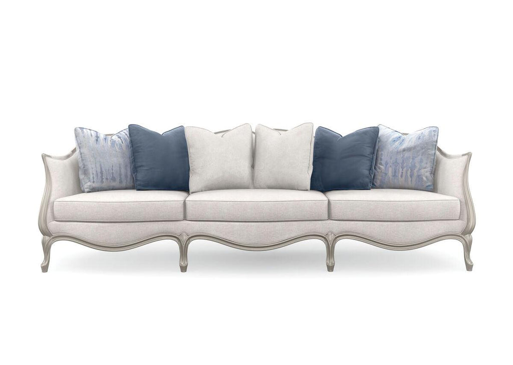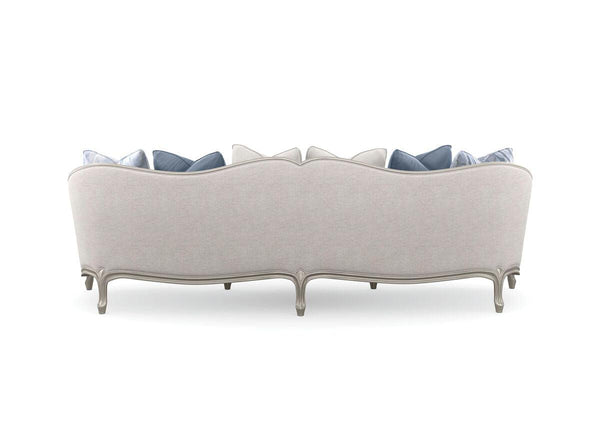With a classic silhouette influenced by French elegance, this sofa makes a gracious statement in a soothing oatmeal-colored performance fabric. Soft curves invite the eye, while cabriole legs and ribbon-like wood trim add impact in a metallic finish. Velvety pillows in varying shades of blue lend a look that’s refined, yet stately. Pairs perfectly with the Special Invitation chair
