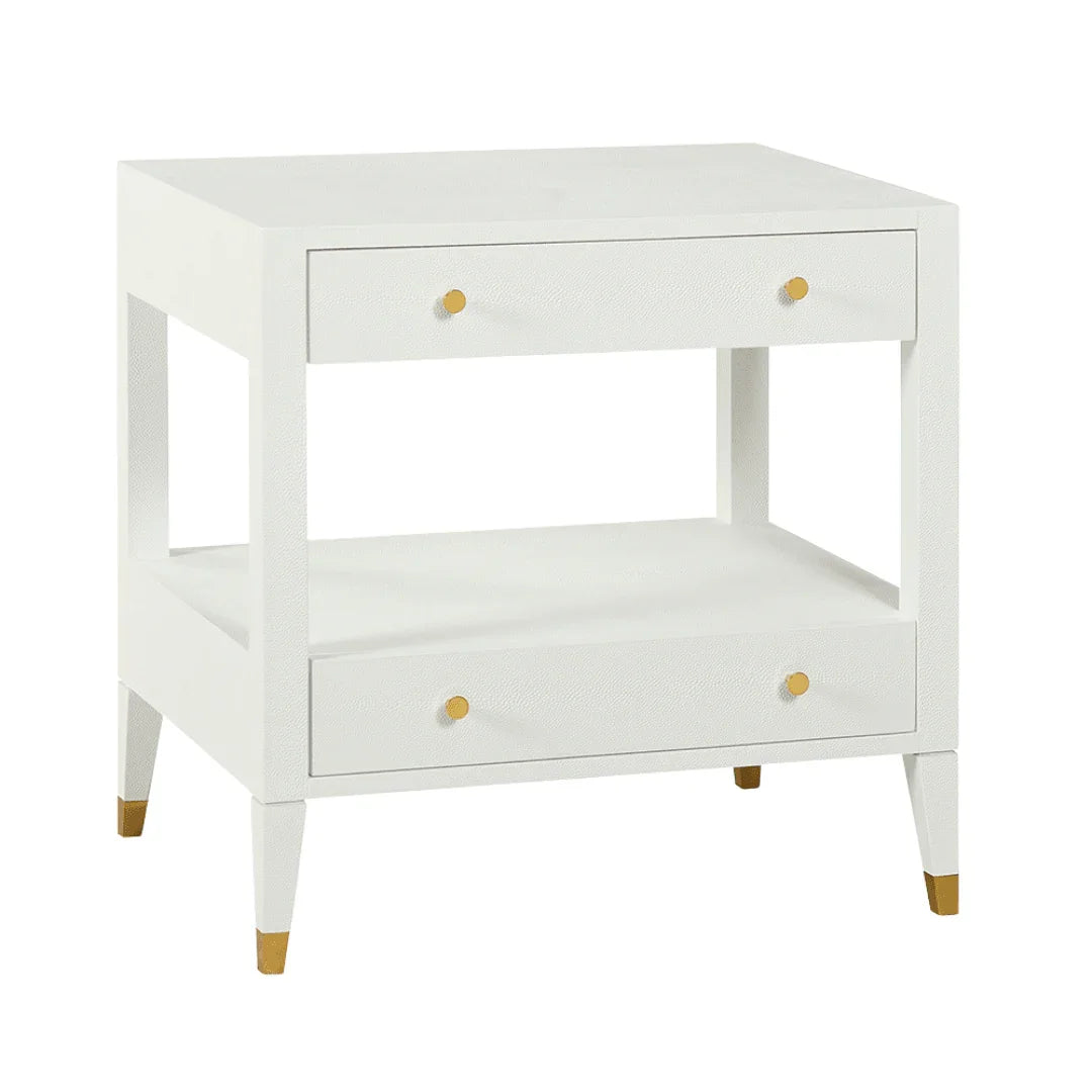 Our Stanley Side Table features two storage drawers and an open storage shelf, brass hardware, and four tapered legs with brass ferrules