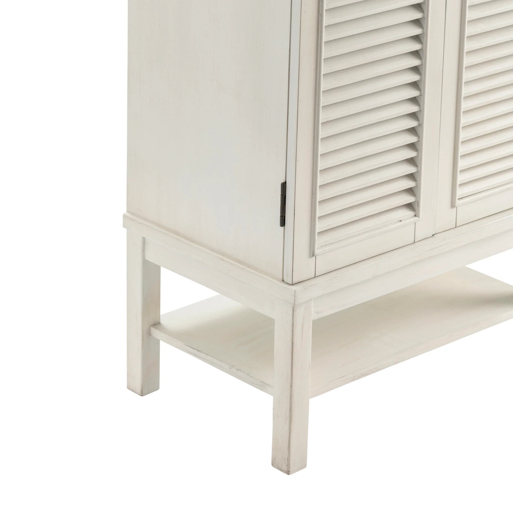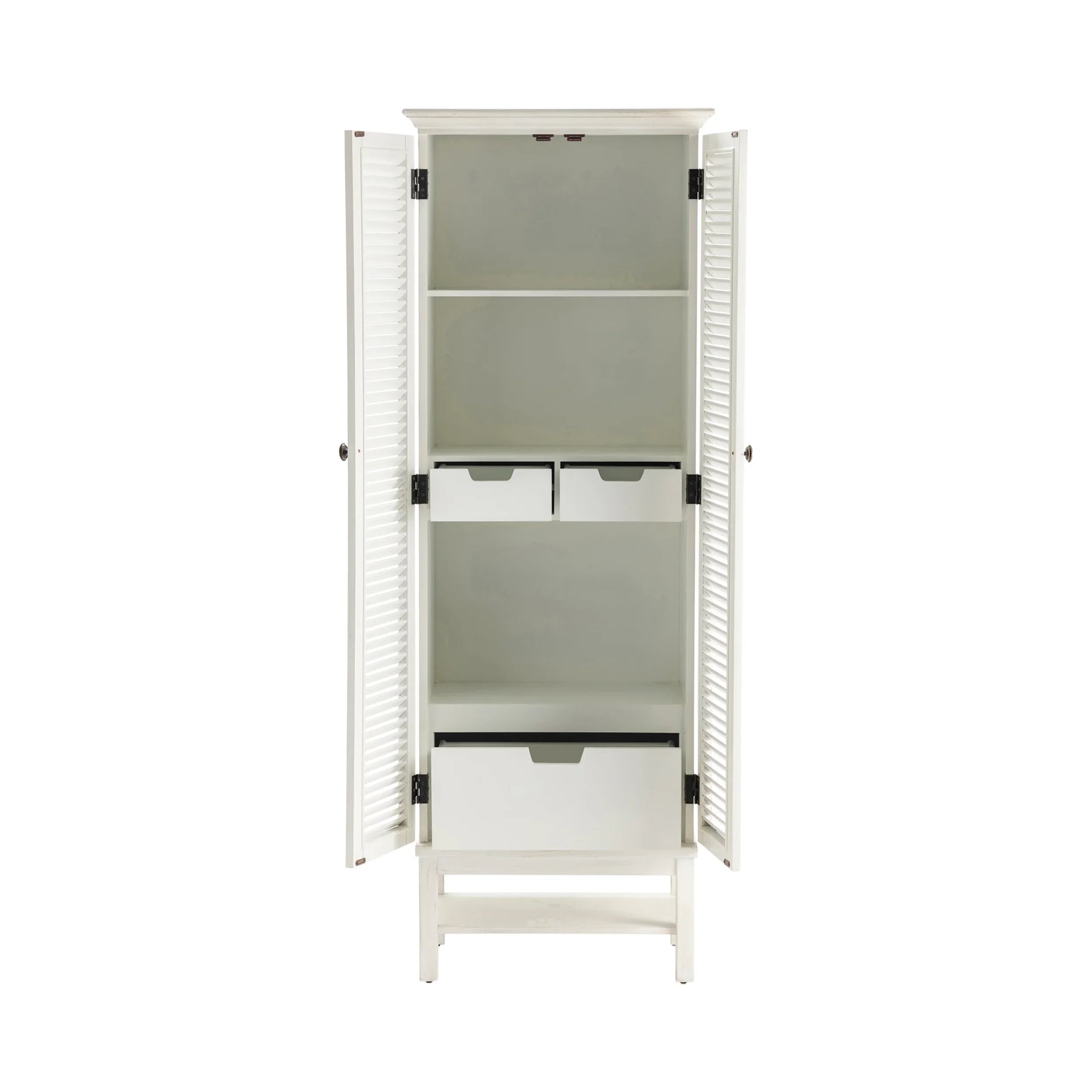 Maximize vertical storage in coastal style. Louvered double doors and an airy raised base give this slim cabinet its cottage character, while six adjustable shelves behind the shutters corral linens, pantry goods or board games without hogging floor space.