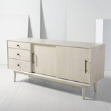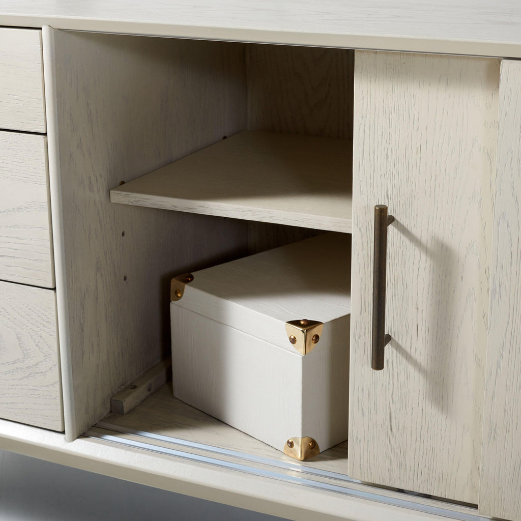 This Tomas Media Stand elevates any entertainment space with Mid-Century chic and modern flair. Perfect for discrete storage in staggering style with two doors and three drawers, Tomas's sleek finish and rich oak veneer make it a new contemporary classic, while bronze-finished pulls add a hint of shimmer.