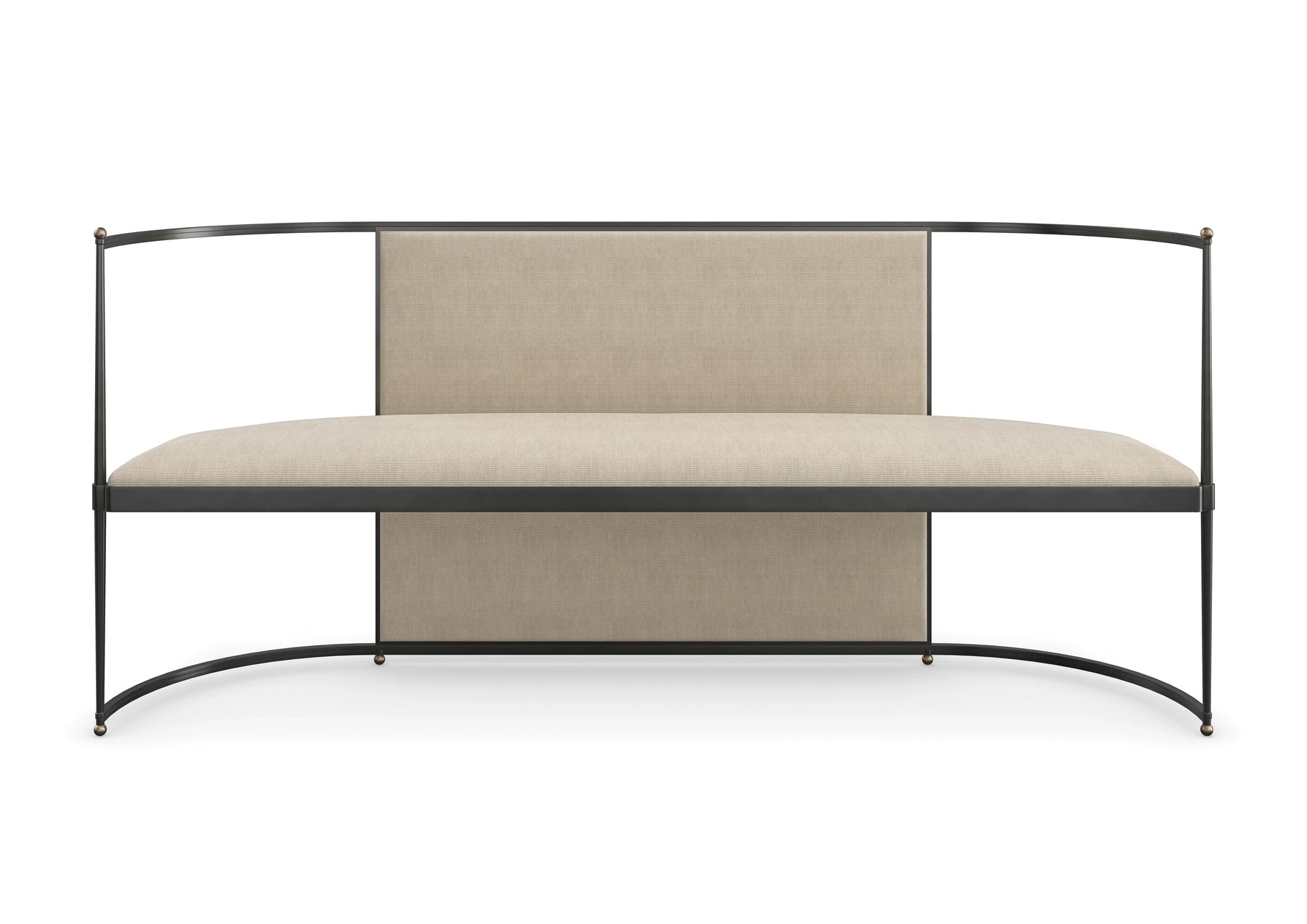 Fashionably tailored in a wool blend fabric with a micro stripe, this elegant bench recalls the exquisite metalwork of wrought iron furniture found in French patio gardens. Its curved metal frame adds warmth and subtle shimmer, accentuated by decorative balls in a Brushed Gold finish. Features an open design that can float in a room, or style at the end of our Provence bed to complete the look.