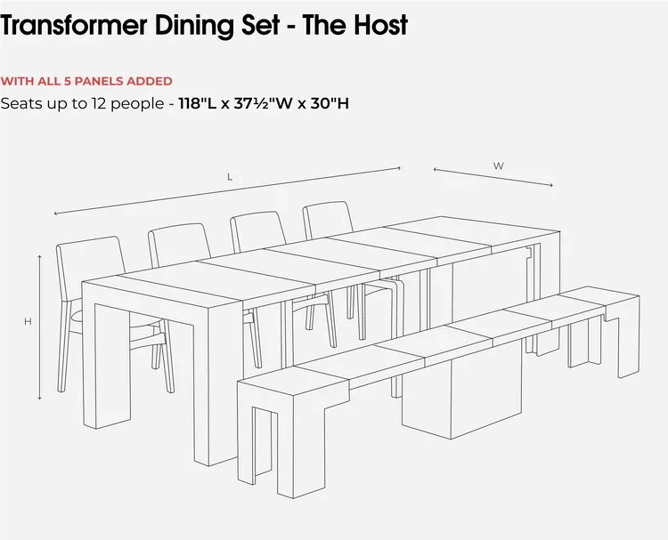 The Host The Transformer Dining Set – The Host features our signature extendable dining table, making it perfect for both intimate meals and large gatherings. This set epitomizes versatility offering an elegant dining set for any home, combining functionality with style. Designed to seat anywhere from 2 to 12 people, this set offers the ideal space-saving dining table that grows with your needs, ensuring you have everything you need to host in style for years to come.