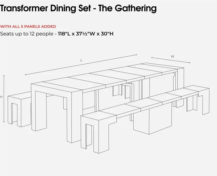 The Gathering The Transformer Dining Set – The Gathering comfortably seats 2 to 12 people ensuring you're always ready for both intimate meals and large gatherings. This dining set is the perfect solution for families and entertainers who value both style and versatility, accommodating all your hosting needs. This extendable dining table set maximizes seating while offering convenient storage options, making it ideal for space-conscious homes.