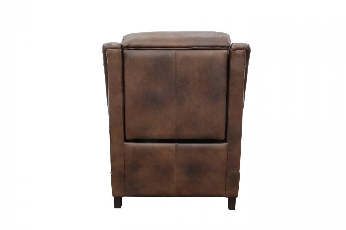 Traditionally styled smaller scale power recliner with articulated power head rest. Features winged pub back design, pleated shaped arms, and box seat styled pad over chaise seating with pocketed coil springs encased in foam, wrapped in Dacron with down blend feather topper. Nail head trim accents the wings, arms, shapeed bottom rail and foot board. Wood legs are in a reddish-brown merlot finish. Power button have USB port, memory button and auto close button