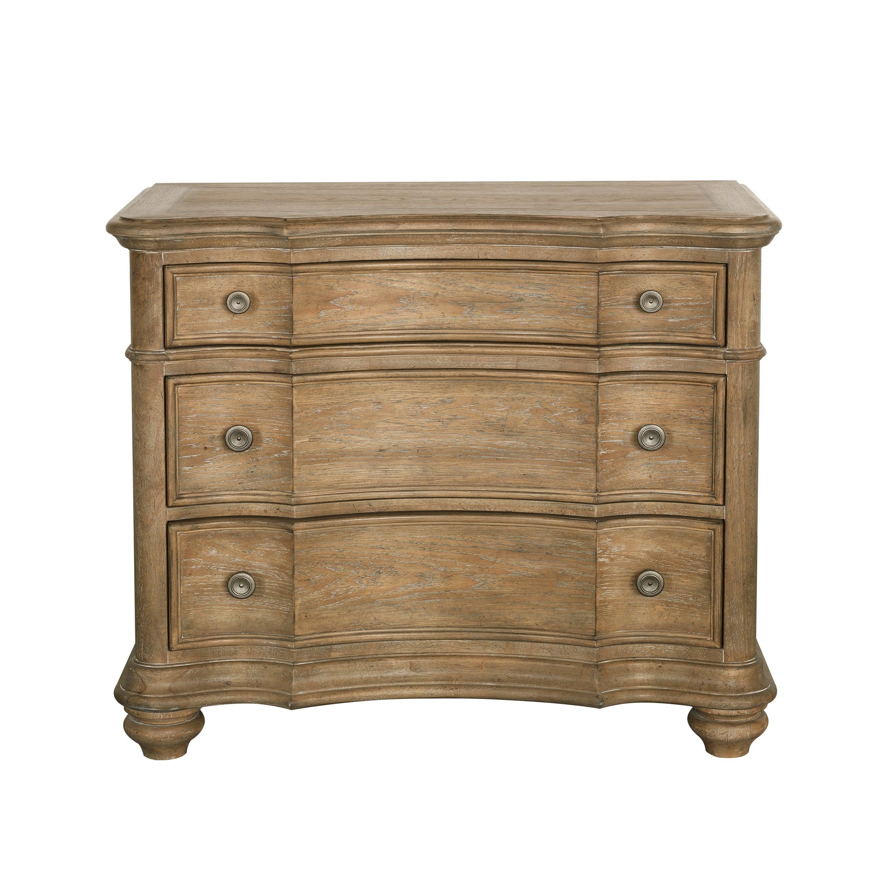 Bring the essence of an elegant home in the French countryside to your bedroom with Weston Hills Bachelor's Chest. This piece features three drawers with felt-lined tops and cedar-lined bottoms, accented with understated pewter-finished knob hardware for an effortless look. White cerusing on cathedral hickory veneers enhances the grain and adds softness to the warm tones of the wood. Shapley fronts, rounded corners, and walnut inlays add distinction and character. Weston Hills --perfectly timeless, perfectly today, perfectly you.