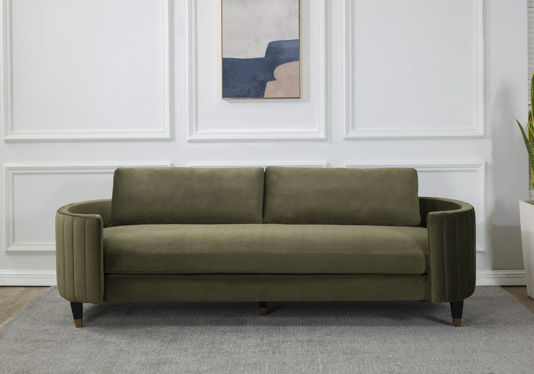 The Winford Velvet Sofa's construction reflects Safavieh Couture's uncompromising standards. Sumptuous and inviting, this modern velvet sofa is a luxurious focal point in any living room. Crafted with a hard wood frame, its plush upholstery is paired with warm brass hardware and an espresso finish on its retro style legs. Brass-finished hardware and accents develop a living patina over time, deepening the piece's character. Available in Grey and Green, the Winford Velvet Sofa adapts its palette to a range of interior directions.