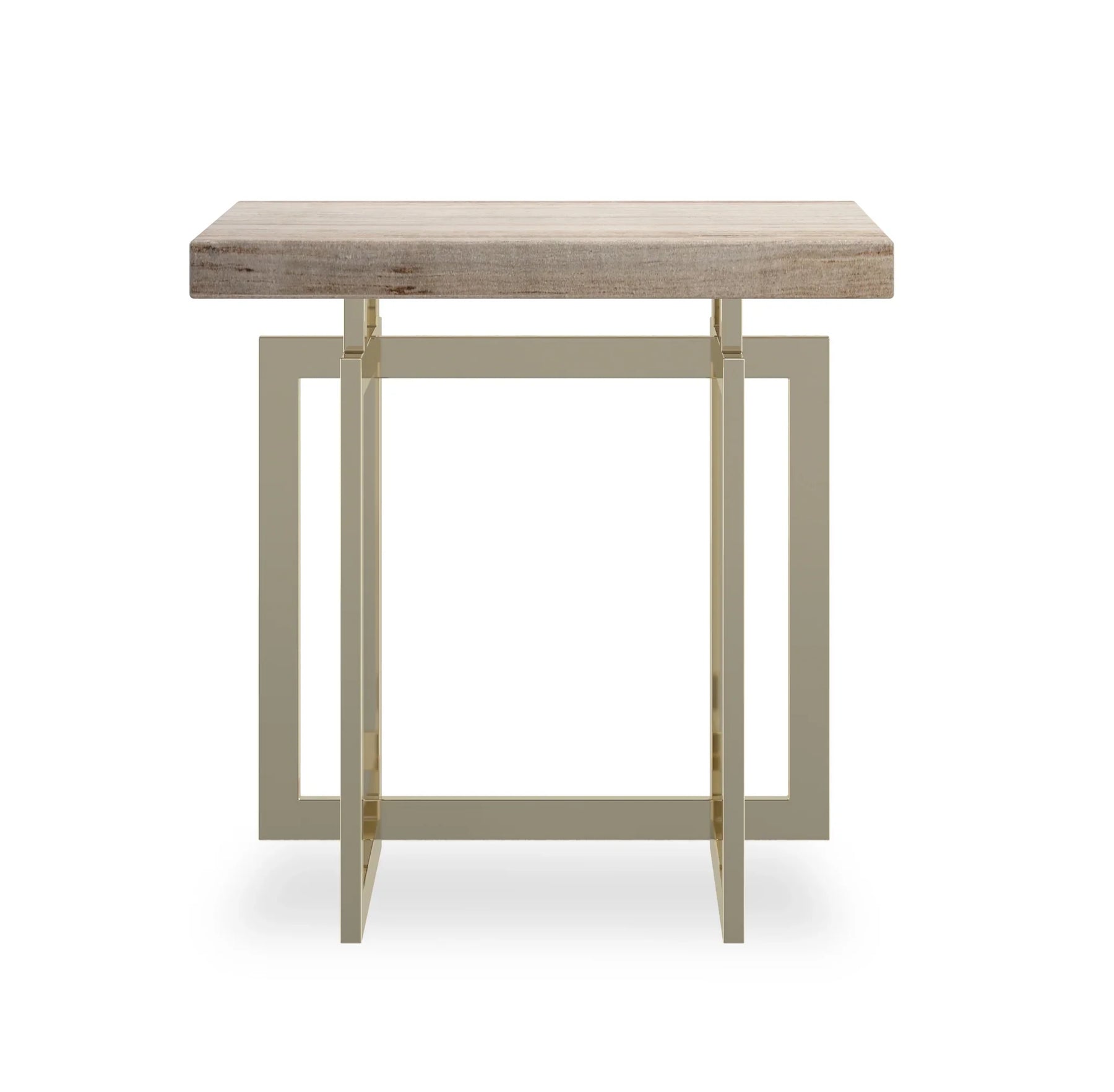 An extraordinary example of organic luxe, the Wish You Were Here End Table offers a gray flowing sandstone top where earthy tones meld with greiges and soft grays to create a visual that’s sleek and modern while still feeling warm and natural. A bold, open geometric base finished in Whisper of Gold creates a mix of materials and brings in the glamour.