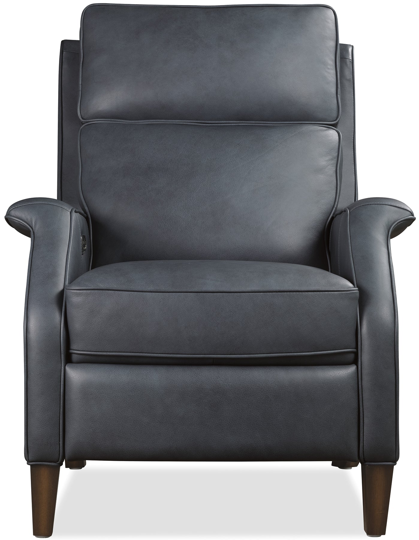 Modern comfort meets refined style in the Wrenn Recliner in Ankur Blue leather. With flared arms and a tailored silhouette, this recliner features power recline, a power headrest, and built-in USB charging. Welt detailing and bustle back construction offer a polished yet cozy aesthetic for transitional living rooms.