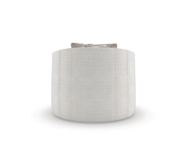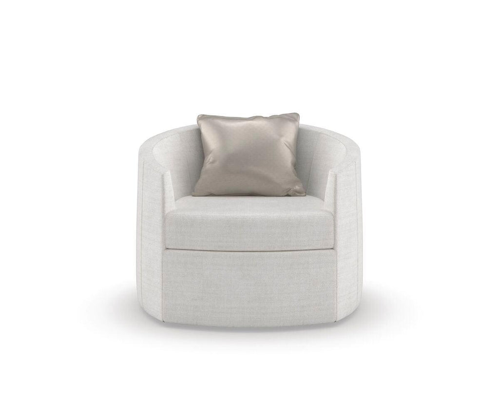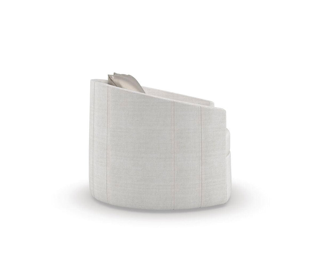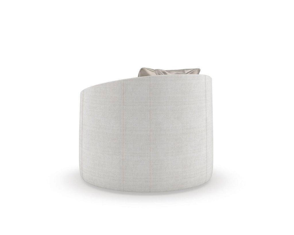 Pleated seams add a subtly sophisticated detail to this softly rounded swivel chair, finely tailored in an easy-care chenille performance fabric. An elevating addition to any seating area, its gracefully curved silhouette appears to float atop a recessed plinth base in an Almost Black finish. A feather down pillow in shimmering satin adds a luxe finishing touch. Matching sofa also available.